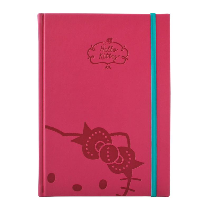Hermosa Libreta Hello Kitty de Pasta dura, elástico de cierre y cubierta grabada. Hojas rayadas con impresión y espacio para fechas.